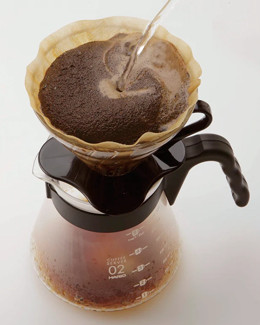 Die Besonderheit beim V60 Dripper ist die Kegelform der Filterwand, die eine Neigung von 60 grad aufweist und geschwungene Rippen an den Innenseiten des Filterhalters hat. In Kombination mit der 20mm groß Öffnung im Boden, kann der Kaffee schnell und gleichmäßig extrahieren und durch den Glasfilter laufen. Dadurch lässt sich mit Mahlgrad und Kaffeemenge die Extraktionszeit bei jedem Brühvorgang beeinflussen.